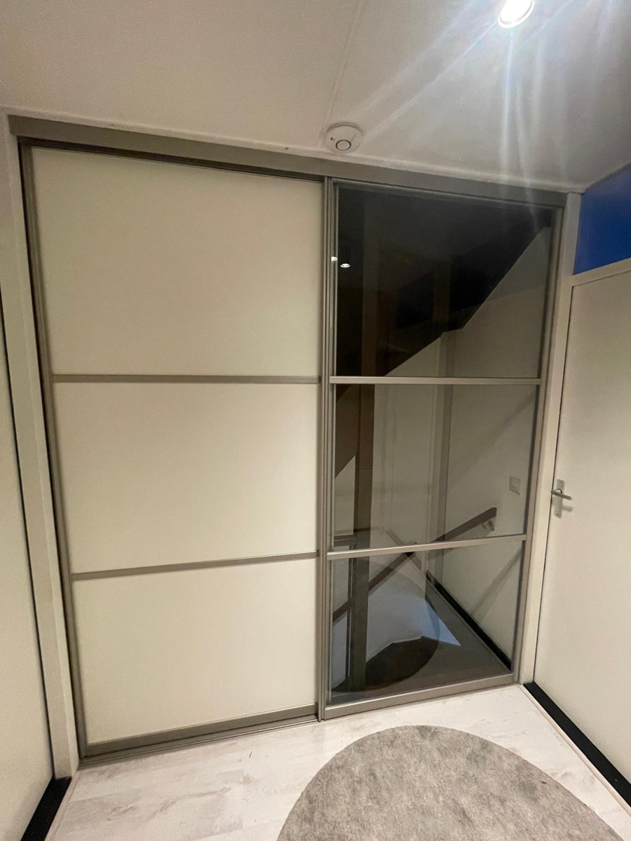 Schuifwand dubbel combinatie worden gemaakt van aluminium en zijn daarom een ideale oplossing voor bijvoorbeeld het afsluiten van een trappenhuis of om een kamer en suite te creëren. De deuren worden geleverd inclusief boven- en onderrails waarbij de bovenrails zowel in het plafond als in de wand kan worden geschroefd. De onderrails wordt geplakt op de vloer en is dus ideale oplossing voor als u vloerverwarming heeft.