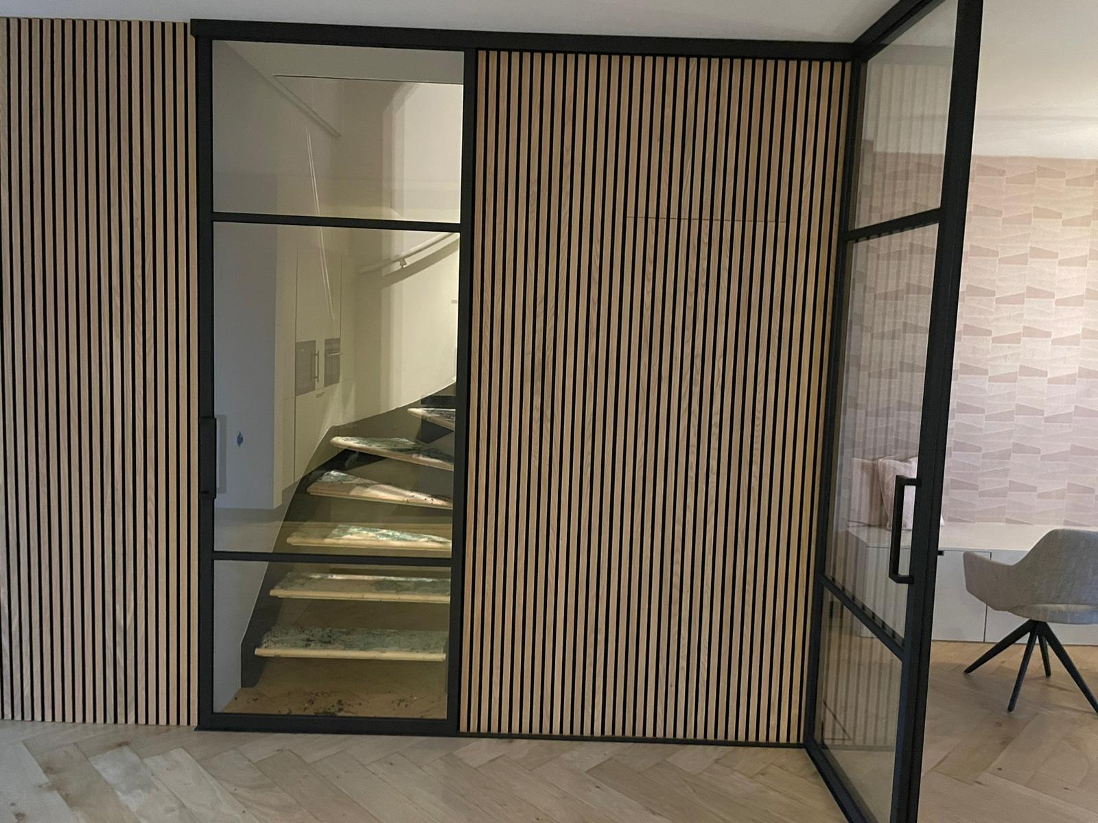 Wat de schuifdeur extra bijzonder maakt, is de mogelijkheid om de Lamelio wandpanelen niet alleen op de deur, maar ook op de wand te monteren. Zo creรซer je een naadloos geheel waarin deur en wand in elkaar overlopen โ een echte designstatement.